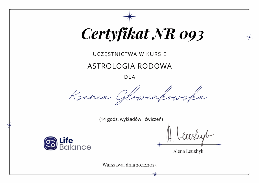 Jestem przede wszystkim samoukiem, wiedza Astrologiczna sama wskakiwała do mojej głowy, nawet nie zdawałam sobie z tego sprawy. Ale żeby ja pogłębić i usystematyzować uczestniczyłam w kursie u Karoliny z Jako w Niebie, a całkiem nie dawno zrobiłam roczną szkołę Astrologii Tradycyjnej drugiego stopnia. Mam za sobą wiele godzin spędzonych na różnych webinariach, Polskich i zagranicznych, oraz pomniejszych kursach. Ponad to cały czas czytam książki i prowadzę dyskusje z innymi Astrologami i Astrolożkami. Od niedawna sama udzielam Astro Korków – co okazało się również ciekawą lekcją o Astro dla mnie.